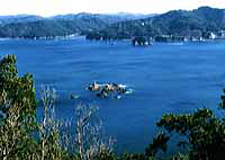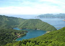 標高191mの高台にあり、かさらぎ・見江島・橘・あけぼのと名付けられた4つの展望台があり、それぞれからリアス式の海岸線や阿曽浦に架かる赤い親子橋などを見ることができます。12、1月の14~15時に限られますが、眼下の贄湾で50~70隻の海老網の船が一斉に出港し、青い海が一瞬にして航跡で真っ白になります。この光景は一見の価値あります。