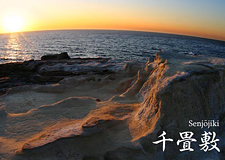 | 太平洋の青い海を背景に広がる大きな白い岩盤。これは長い年月をかけて打ち寄せる荒波に浸食され、岩だたみのような景観となりました。水平線に沈む夕陽はまさに「絶景」です。 | |