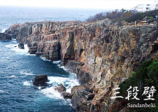 千畳敷の南海岸にそそり立つ高さ50mの断崖。その昔、漁師たちが通りゆく船や魚の群れを見張った場所「見壇」に由来するといわれるこの大岩壁は、南北2kmにわたって展開され、岩肌に打ち寄せる黒潮が激しくぶつかり合うダイナミックな光景には、自然の迫力を感じずにいられません。
