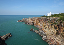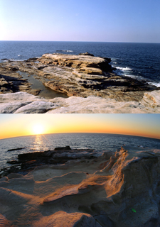 | 広大なスロープ性砂岩が海中に突き出し、波の砕ける風景が壮絶そのものの『千畳敷』(せんじょうじき) は、その名のとおり広い岩畳を思わせる大岩盤。 瀬戸崎の先端から太平洋に向けて突きだしたスロープ状になった白く柔らかい岩は第3紀層の砂岩からなる大岩盤で、打ち寄せる荒波に浸食され壮大な景観を創っています。 | |